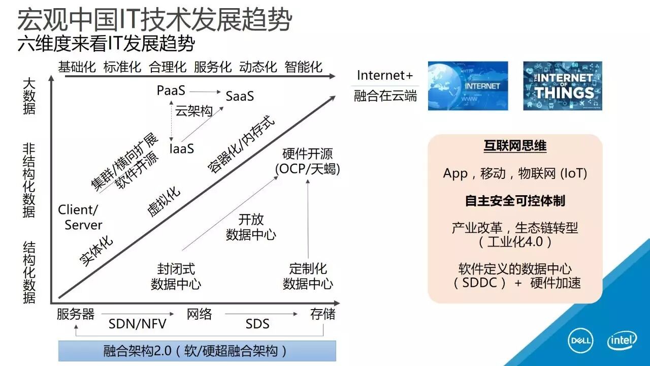 针对中国的业态,戴尔专家总结了IT六个维度的趋势,即从基础的体系融合,到标准化、合理化、到服务化,直至到更高的智能化。戴尔不断研究技术的发展,在这样的融合中戴尔的追求就是希望用创新的技术、不断提升效率,去支持企业可持续的发展。在这样的目标下,希望为企业带来一套严谨的IT方案,从IT的角度,不断优化企业的传统模式,带来流程的改变,让新的IT引擎给客户带来商业模式的创新。