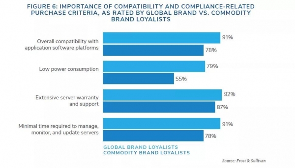 现代服务器必须能够在企业操作环境中工作,并支持基础架构管理层和操作软件层,它们还必须符合环境合规和安全因素的企业标准。这些具体的标准影响了IT决策者对服务器品牌的选择,结果下图所示,对于兼容性与合规性的各个细分,全球领先服务器品牌忠诚者依然有着更高的要求。